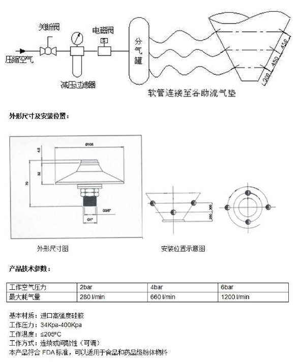 助流氣碟采用了耐磨的硅膠材料,在工作時可以同時產生吹氣、振動兩種動作,壓縮空氣沿筒倉壁向四周噴出,而且由于空氣壓力不斷變化,氣碟邊緣會產生高頻振動.這些都是有效促進料倉內粉體、顆粒物料向下流動。建議間歇性工作。注:工作溫度-30℃< 120℃